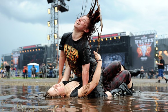 Che dire di questo ultimo W:O:A? Personalmente lo definirei “fiacco”. Si, fiacco è la parola che a mio avviso connota meglio il W:O:A di quest’ anno. Il tutto appariva come ovattato, come sopito. Anche la gente era meno chiassosa e festosa delle volte scorse. Insomma si percepiva nell’aria il sotto tono generale. Complice anche un meteo inclemente che ha rovesciato pioggia su pioggia per tutta la durata del festival, generando una palude di fango indescrivibile che rendeva meno godibile il tutto. Oddio, qualcuno ha anche apprezzato, dicendo che faceva molto “metal”, ma la verità è che ha reso tutto più complicato, al limite fastidioso. Considerate che anche il camping è stato aperto praticamente all’ ultimo, causa terreno impraticabile e questo già toglie una gran fetta dell’ universo W:O:A., dove nel camping si esprime l’ anima “metal” dell’ evento. Aggiungiamo una line up modesta, comunque non degna dei Wacken passati, fatta eccezione per un paio di nomi sul palco tra cui i Volbeat, i Dimmu Borgir, i Cradle of Filth, gli Amon Amarth, In Flames, Sepultura e gli Scorpions, dei quali spenderò qualche parola alla fine. Il primo giorno si è svolto in maniera meno drammatica dei successivi. Il terreno era pesantemente intriso di acqua, ma la rigogliosa erba rendeva accettabile lo stare seduti in terra ascoltando magari qualche gruppo che non interessava moltissimo, sorseggiando una fresca birra o addentando un succulento panino con wurstel. Immancabile l’ apertura della splendida e biondissima DORO, Dorothy Pesch, con la sua presenza scenica importante, oramai ospite fissa con il suo inno We Are The Metal Heads. Quest’anno si festeggiava sul palco anche il compleanno del “mitico” UDO, oramai sessantenne e con un fisico tarchiato. Duettando con Doro hanno allietato i metallari della mia età (non proprio giovanissimi). A seguire, molto potenti e soddisfacenti, i Sepultura con Les Tambures du Bronx, un gruppo di percussionisti di bidoni di lamiera, che hanno generato uno spettacolo coinvolgente e ritmicamente potente in ottima sinergia con la band brasiliana.